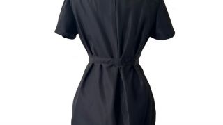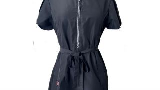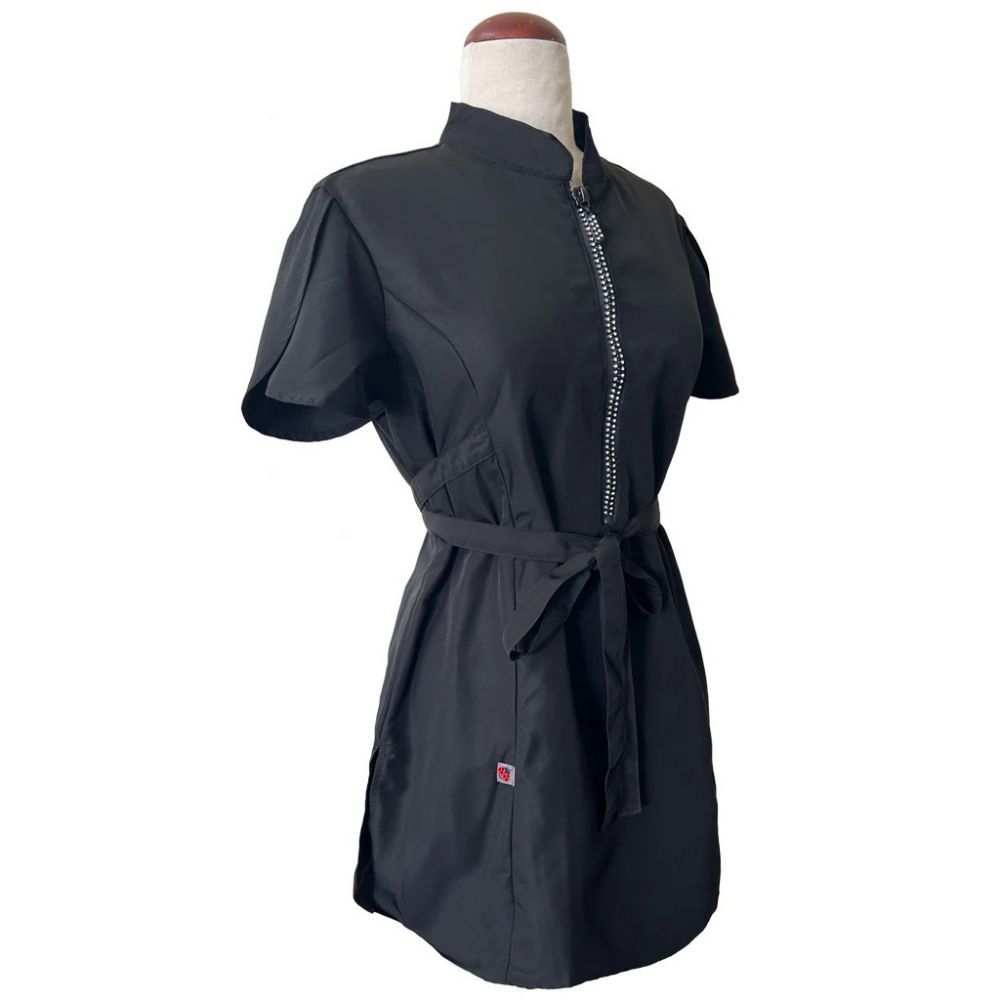 Klasická čierna tunika so polozipsom a kryštálikmi – elegancia stretáva funkčnosť! Ideálna pre groomerov, kaderníkov a ďalších profesionálov, ktorí si cenia štýl pri práci.