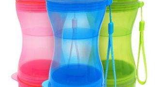 Fľaša má dva oddelené priestory, takže si môžete vziať vodu, maškrtu alebo krmivo pre svojho psa do jedného kontajnera na prechádzku, pešiu turistiku.
