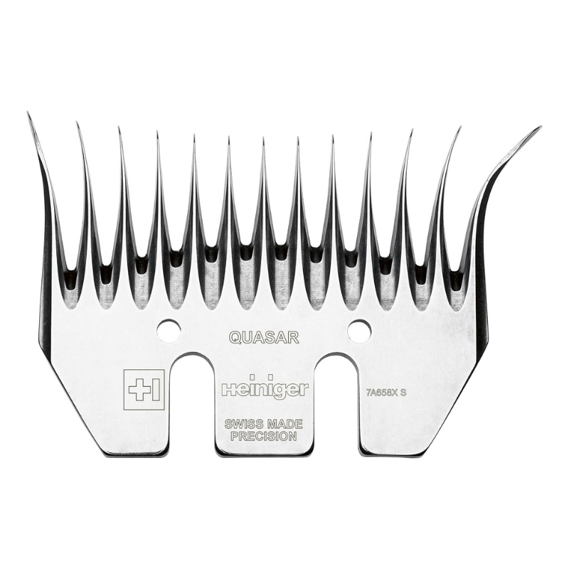 Hreben hlavica na strihanie oviec Quasar výrobca Heiniger 13 zubov. Vďaka šírke hrebeň získa počas orezávania viac vlny.