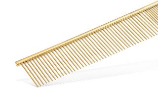 Tento vysokokvalitný hrebeň pre psov má medenú rukoväť a zuby z nehrdzavejúcej ocele pokryté niklom so zlatým efektom. Zuby sú z polovice jemné a z polovice široké, čo umožňuje všestrannú starostlivosť.