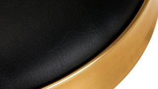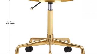 Táto zlatý taburet má pohodlné čierne sedadlo potiahnuté ekokožou a je umiestnená na stabilnej nohe s piatimi kolieskami. Je vyrobený z kovových zliatin, je trvanlivá a odolná voči poškodeniu. Výška sedadla je účinne nastaviteľná. Plastové kolieska umožňujú jednoduché premiestňovanie. Sedadlo je otočné v celom rozsahu.
