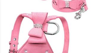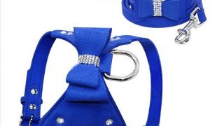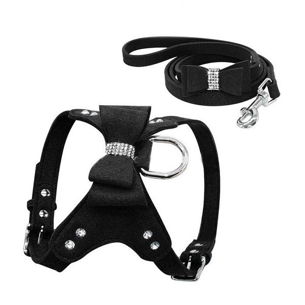 Vodítko a postroj sú zdobené kryštálmi Swarovski. Ozdobný mašličkou je veľmi pôsobivý a veľmi elegantný. Pre pohodlie vášho domáceho maznáčika vodítko a postroj sú vyrobené z mäkkého velúru, ktorý je na dotyk jemný, čo nebude vášho psa dráždiť.
