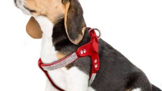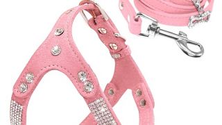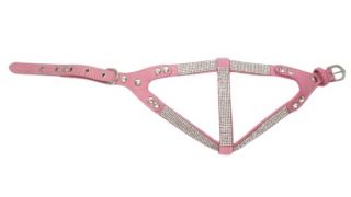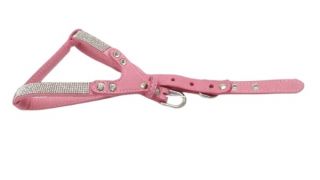 Postroj pre psa, veľkosť L, zapínanie na chrbte striebornou sponou, zdobený zirkónom a kryštálmi. Vodítko rovnakej farby s ozdobou v tvare kosti zdobená striebornými zirkónmi.