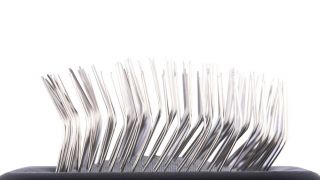 Kefa na úpravu srsti, ktorá má pohodlný zahnutý tvar a striedavo umiestnené ihly s dvojitou dĺžkou.