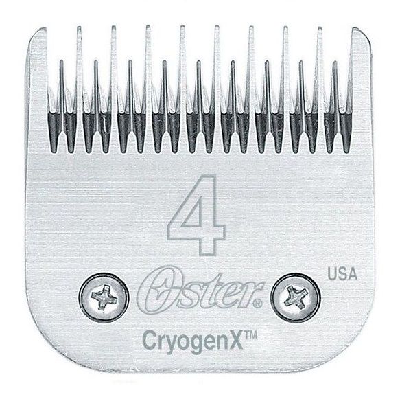 Strihacia hlavica Spoločnosť Oster Cryogen-X číslo 4 je čepeľ so striedajúcimi sa zubami (skip tooth), zuby na spodnom kotúči sú usporiadané striedavo (dlhší zub, kratší zub, dlhší zub, atď.) na prvé skrátenie srsti na dĺžku,.prevažne zanedbávané, plstené alebosilne zacuchanú.