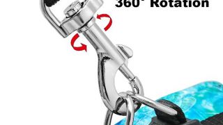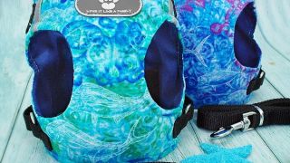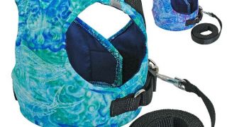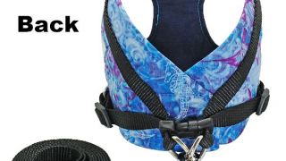 Beztlakový postroj v krásnej modrej a zelenej farbe a čierne vodítko vyrobené zo 150 cm pásky upevnené karabínkou.