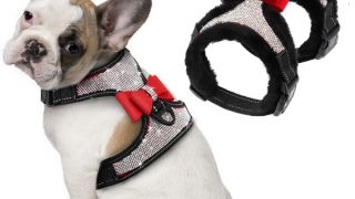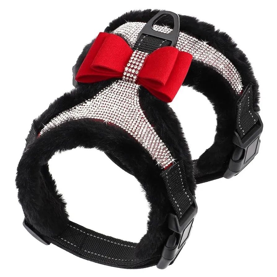 Štýlový nastaviteľný postroj pre malého psa, ozdobený trblietavými kamienkami a roztomilou červenou zamatovou mašľou. Lemovanie z jemnej kožušiny dodáva eleganciu a zároveň zabezpečuje pohodlie. Pod mašľou sa nachádza praktický úchyt na pripnutie vodítka. Vnútorná strana je podšitá mäkkým a príjemným materiálom na dotyk.